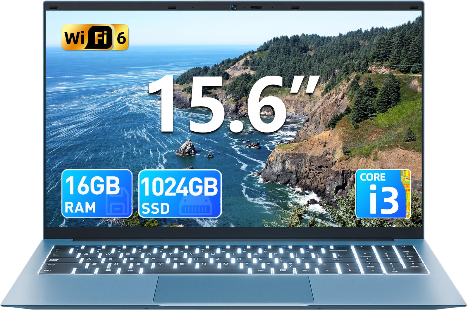 Naclud 15.6 Inch Laptop Computer, Windows 11 Laptops with 16GB RAM 1024GB SSD, Core i3 CPU(Up to 3.9GHz), Backlit Keyboard, 53.2WH Battery, WiFi 6, IPS FHD Display, 180° Viewing, HDMI, Type-C