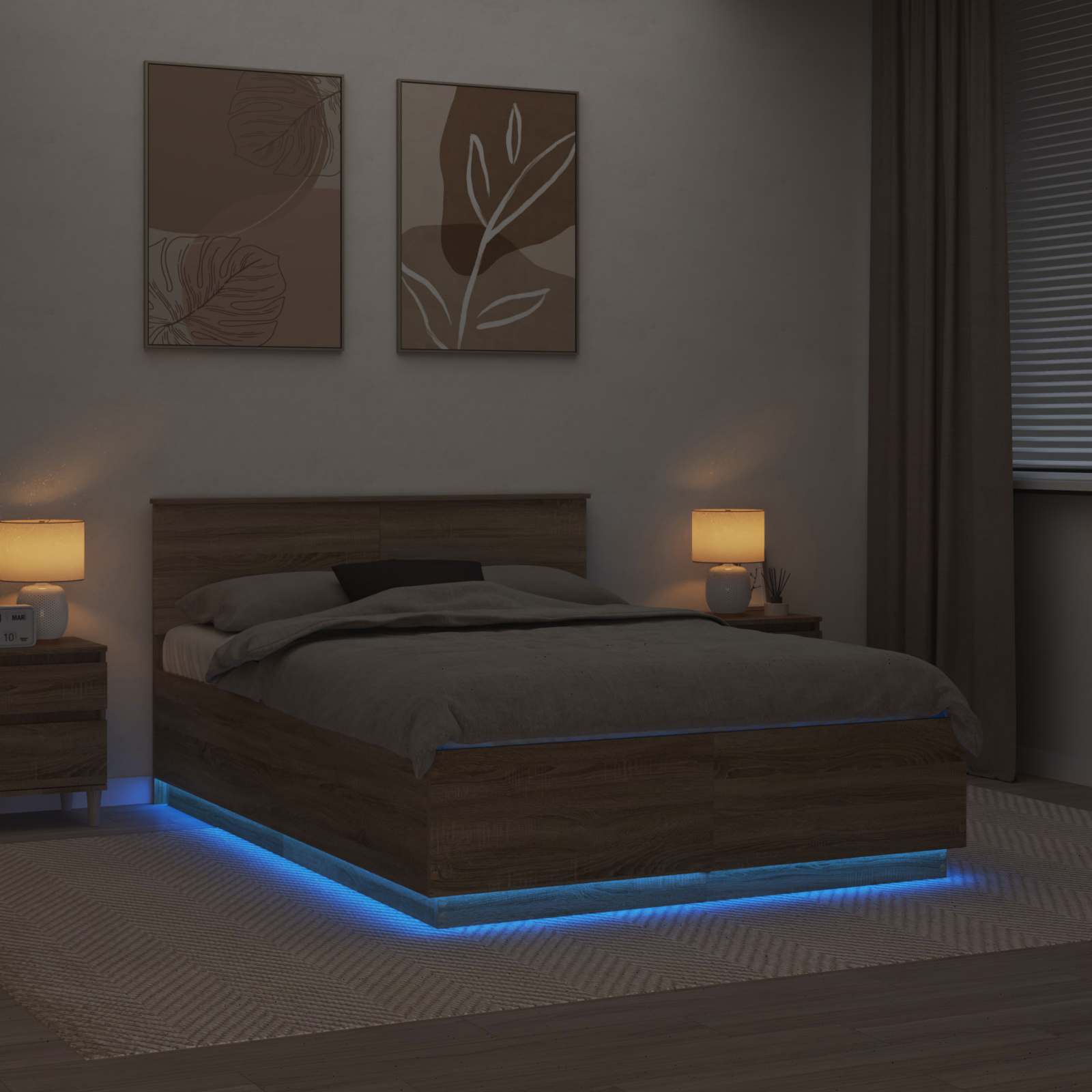 Dieses moderne Bettgestell verwandelt dein Schlafzimmer mit seinem schlanken Design. Der Rahmen aus Holzwerkstoff gibt dem Raum einen minimalistischen Look, der perfekt zu modernen Umgebungen passt. Es ist darauf ausgelegt, dein Schlaferlebnis zu verbessern und ist mit einem verstellbaren Kopfteil und beruhigenden LED-Beleuchtungen ausgestattet - ideal für entspannende Momente. Materialien: Das Bettgestell besteht aus hochwertigem Holzwerkstoff, der stark und formbeständig ist. Diese Materialwahl unterstreicht die moderne Ästhetik deines Schlafzimmers und sorgt gleichzeitig für Stabilität und Langlebigkeit. Enthaltene Komponenten: Das Bett kommt mit einem verstellbaren, wandmontierten Kopfteil, das sowohl Unterstützung bietet als auch Stauraum hat. Die LED-Beleuchtung sorgt für eine stimmungsvolle Atmosphäre, während der praktische USB-Anschluss dir das Laden deiner Geräte vom Bett aus ermöglicht. Eigenschaften/Funktion/Design: Das verstellbare Kopfteil passt sich deinem Komfort an und unterstützt verschiedene Positionen zum Lesen oder Entspannen. Der USB-Anschluss sorgt für unkompliziertes Laden deiner Geräte und die mehrfarbigen LED-Leuchten geben deinem Raum einen persönlichen Akzent. Empfohlene Anwendungen: Perfekt für moderne, minimalistische Schlafzimmer, kann das stilvolle Design dieses Bettgestells jeden Raum in ein trendiges Refugium verwandeln. Es ist ideal für Technikliebhaber, die integrierte Elektronik und einen flexiblen Schlafbereich schätzen. Pflege und Wartung: Um das Bett schön zu halten, einfach mit einem feuchten Tuch abwischen. So bleibt es über die Jahre hinweg ein echter Hingucker und verlängert seine Lebensdauer.