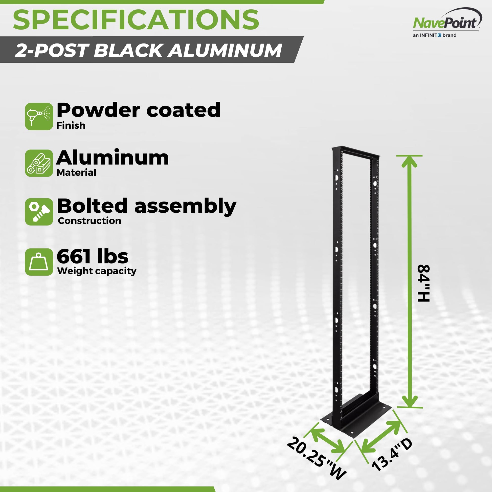 This 2-post open frame rack with threaded mounting holes by NavePoint is perfect for mounting servers and other networking equipment. Made of Aluminum with a powdered coated finish for durability. Flat Packed for easy shipment. Available in a variety heights.