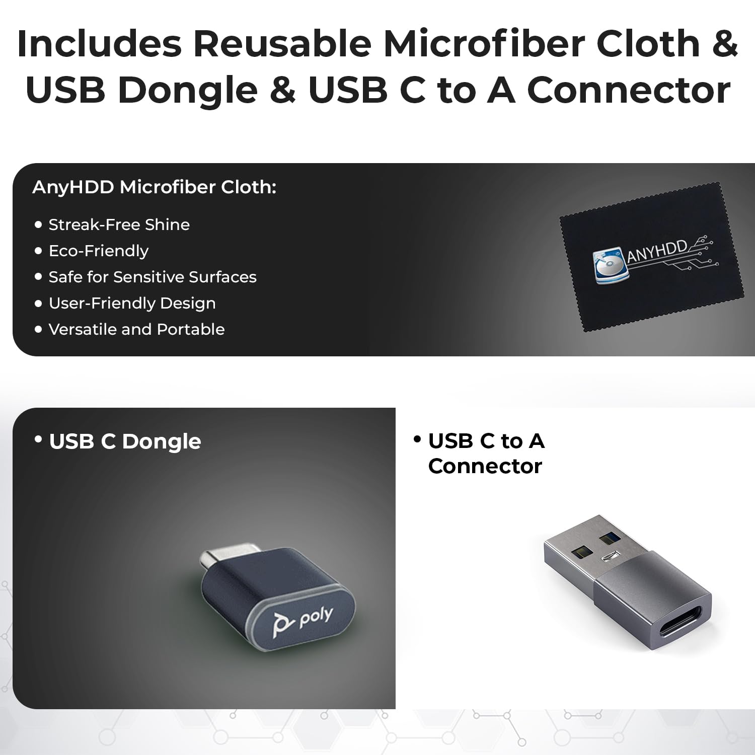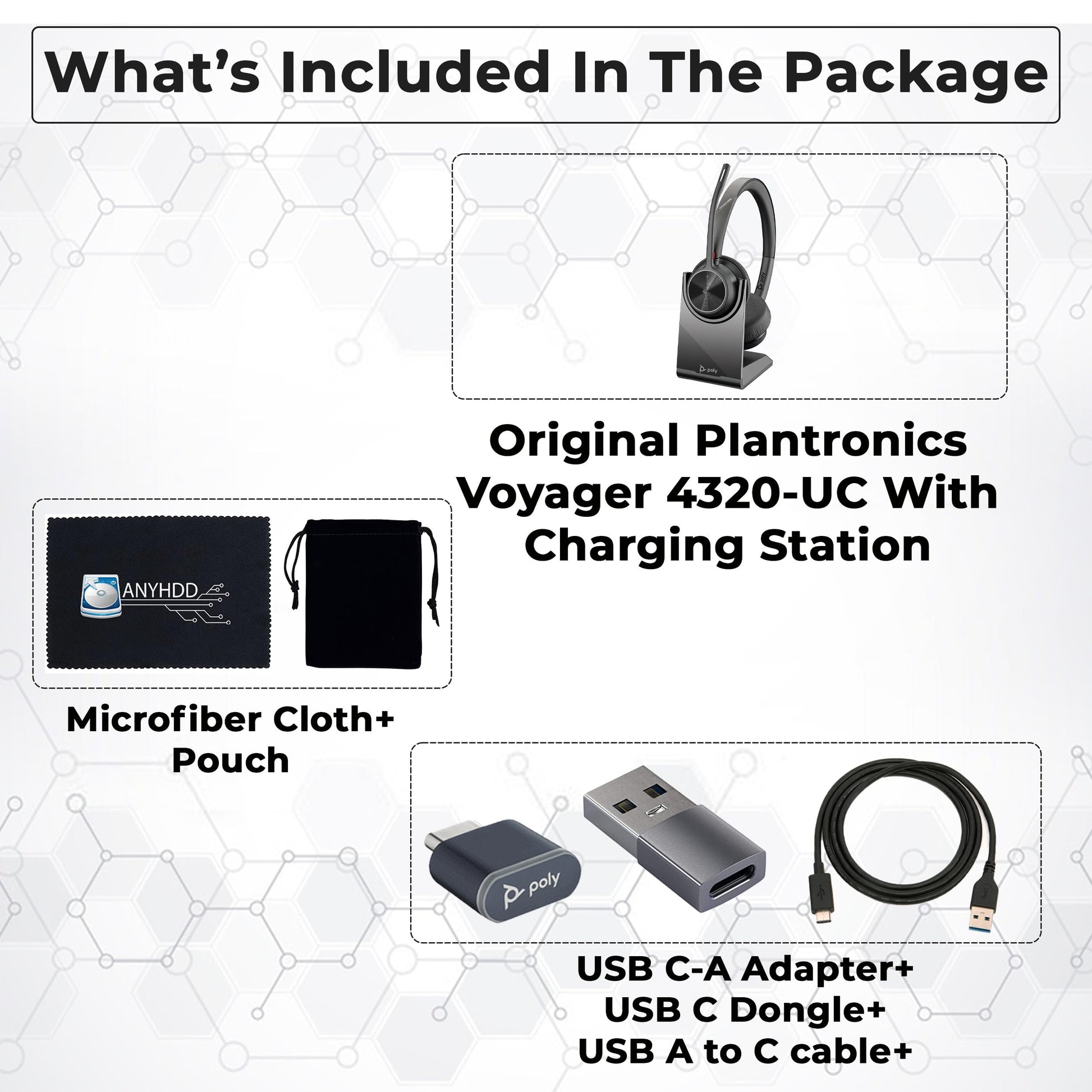 Poly Voyager 4320 UC Wireless Headset & Charge Stand - Stereo Headphones with Noise-Canceling Boom Mic + Charging Station + USB-C to A Adapter + USB C Dongle + USB A-C Cable + Pouch + Microfiber Cloth