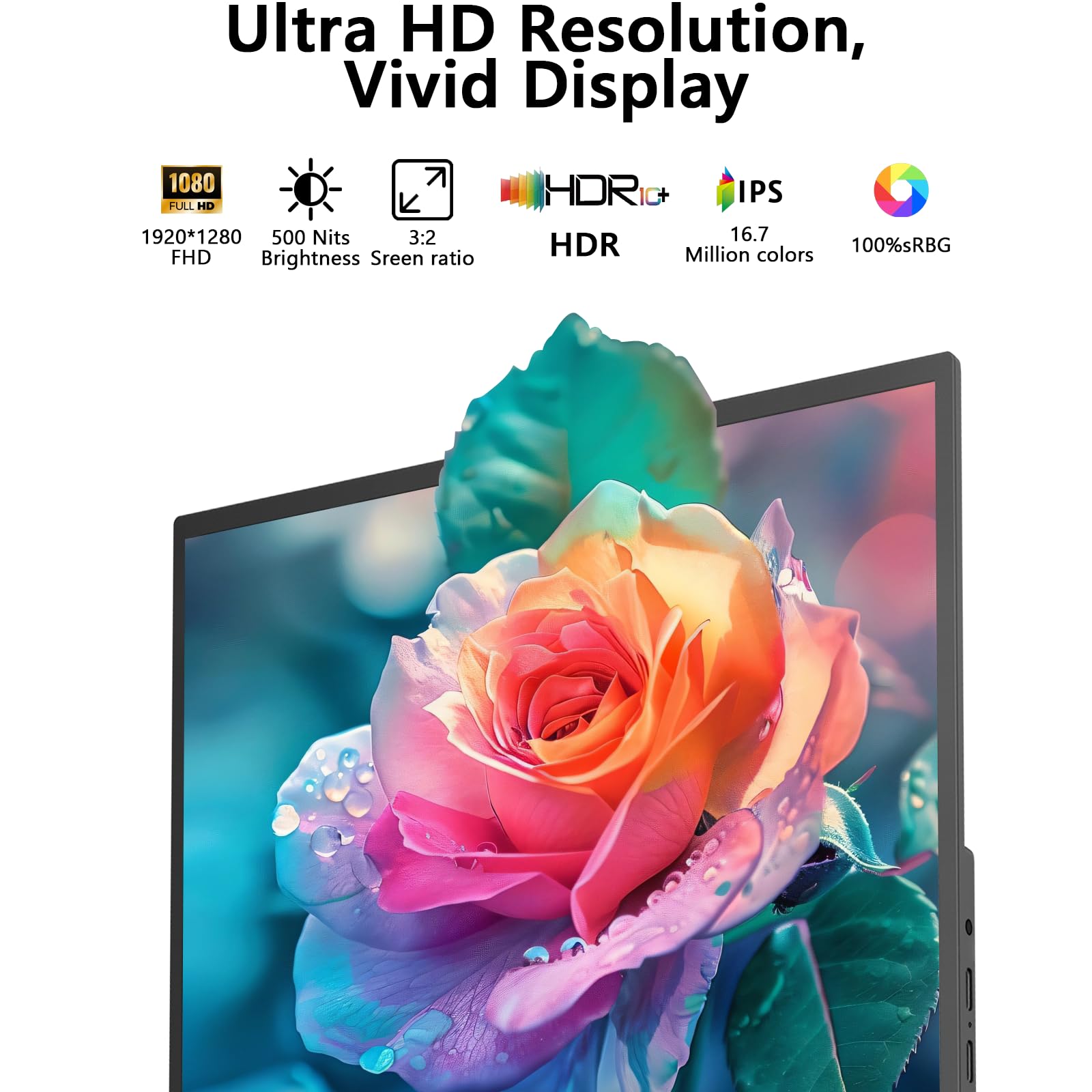 Portable Monitor for Laptop, 10.5" Screen Extender 1920x1280P IPS Travel Monitor 3:2, 500nits, 2000:1, w/45° Adjustable Stand, Standard HDMI USB-C Computer Display for Laptop PC Phone Mac PS4 Xbox