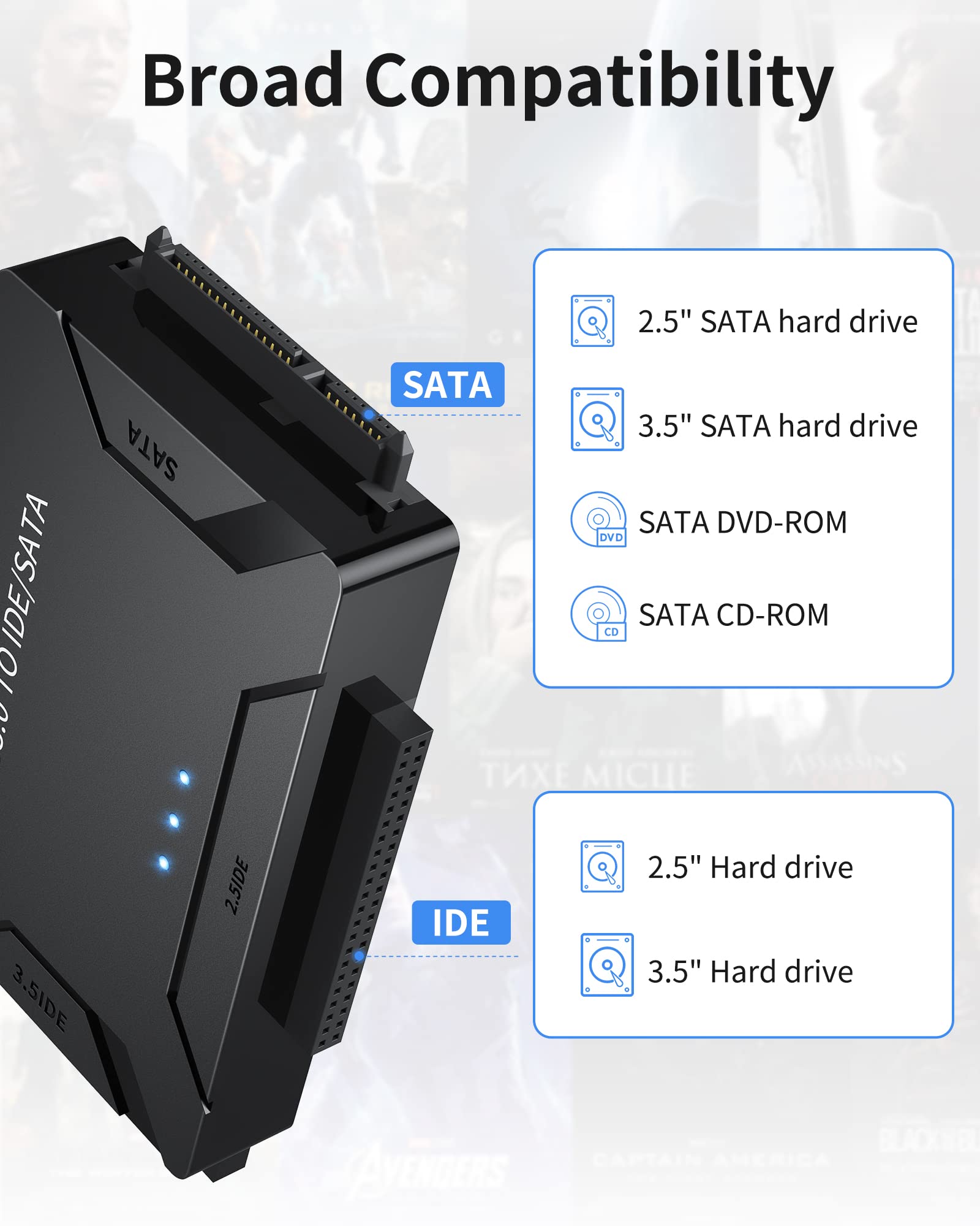 POSUGEAR USB 3.0 to IDE/SATA Adapter, External Hard Drive Reader, Universal 2.5"/3.5" HDD/SSD Converter, 12V/2A Power Adapter