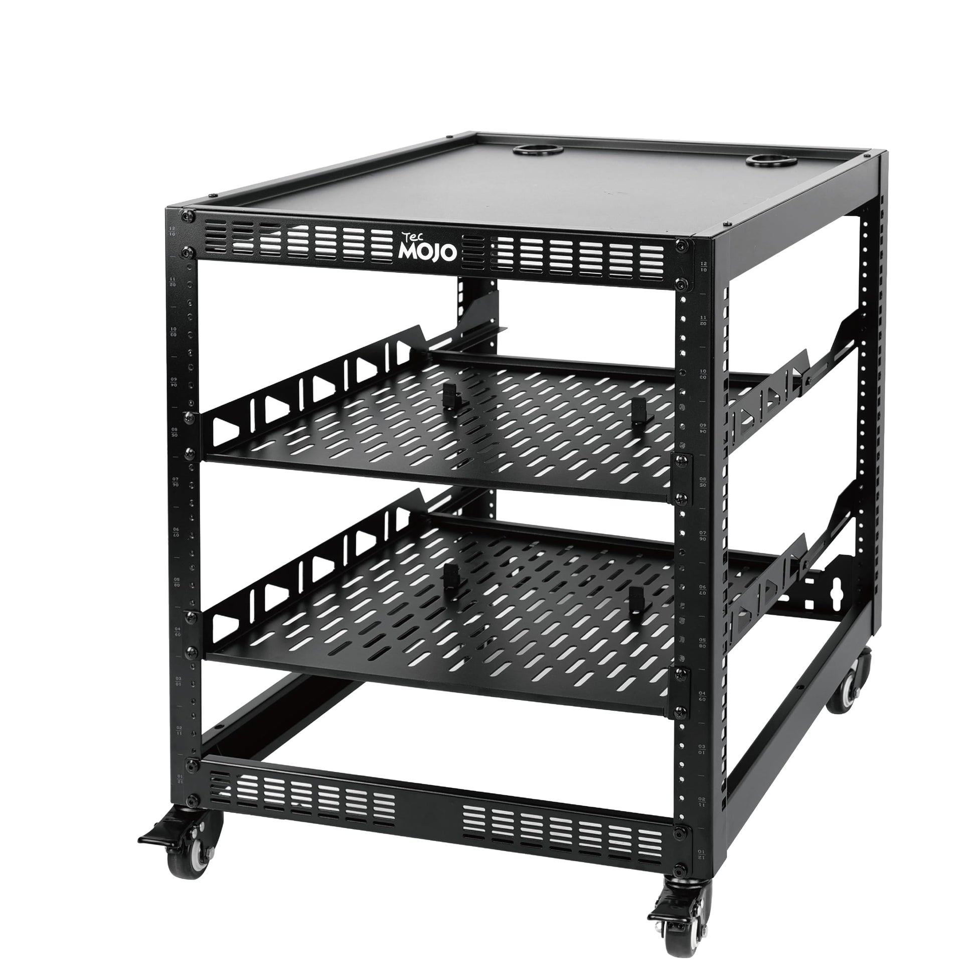 TECMOJO 12U Open Frame Network Rack for IT & AV Gear, 4-Post With Casters, Mobile With 2 PCS 1U Server Shelf & Mounting Hardware, for 19" Network, Audio and Video Device