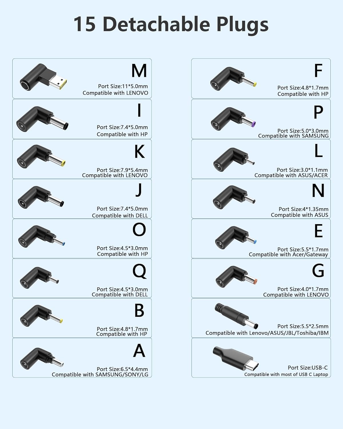 - 15-in-1 Connector Kit – Includes 15 interchangeable tips Compatible with Dell, Compatible with HP, Compatible with ASUS, Compatible with Lenovo, Compatible with Acer, Compatible with Toshiba, Compatible with Samsung, Compatible with LG, Compatible with IBM, Compatible with Gateway& more.