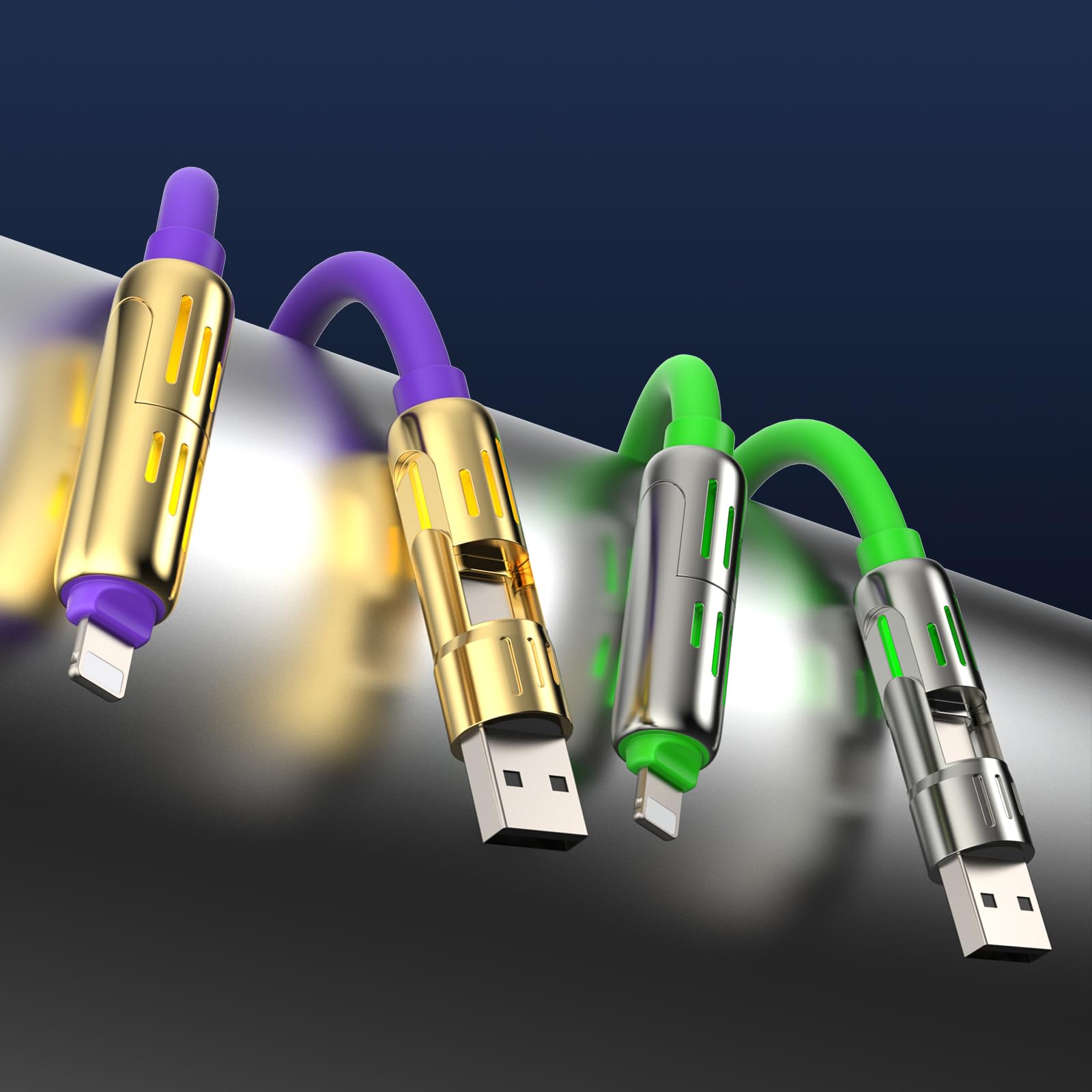MFish 240W 4-in-1 Universal USB Charging Cable [2 Pack, 6.6ft] - Fast Charger Cord with USB-A, Dual USB-C & Lighting, for iPhone 14/15/16/17 Series, iPad & MacBook & More (2PACK, Purple+Green, 6.6Ft)