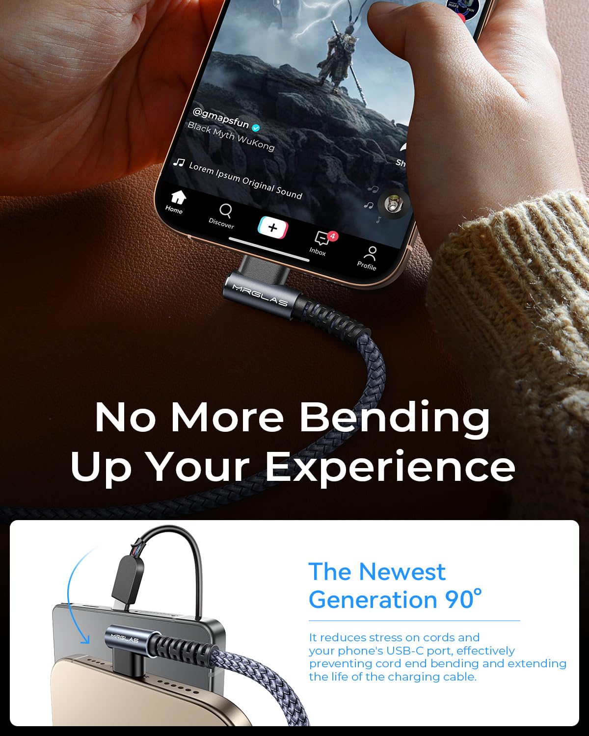 2-Year Promise: We provide 24-hour online service. If you have any questions, please contact us at any time. We’re so confident in our USB-C charger cable that we are areresponsible for all quality issues. This is the only USB-C cable you need to buy. We provide this 4-pack 60W 3.2A premium nylon-braided USB-C to USB-C charger cable with right angle design (10+6.6+3.3+1.6ft). Certified 60W 3.2A Dual Chip Fast Charging: This 4-pack 60W 3.2A USB-C to USB-C cable supports PD3.0/QC3.0/QC4.0 fast charging up to 60W Max (20V/3.2A), which is 3 times faster than the 3.1A version, charging a USB-C for iPhone 17 from 0% to 88% within 30 minutes, an iPad Pro to 78% within 30 minutes, and a MacBook Air to 78% within 30 minutes. This USB-C connection offers data transfer rates of up to 480Mbps between two devices (1200 songs synced per minute). Does NOT support video output. Upgraded Exclusive Right Angle Design: MRGLAS USB-C to USB-C cable features an innovative 90-degree "L" design. It reduces stress on cords and your phone's USB-C port, effectively preventing cord end bending and extending the life of the charging cable. Its user-friendly design makes it more convenient and comfortable for playing games, watching videos, and reading e-books while charging. [Note: Compatible with all phone cases] Upgraded Gold-plated & Officially Certified: MRGLAS USB-C to USB-C cable features a gold-plated design. Compared to other cables, gold-plated plugs avoid energy loss, are rust-proof and anti-corrosive, and last 3 times longer. This fast-charging USB-C cable has a gold-plated plug and meets electronic safety certification standards. Amazing Durability: USB Type-C cables are constructed from sturdy military-grade nylon braided fibers, the most flexible, strong, and durable material available. With a 300% increase in pulling force and a unique stress-relieving support design, it can be used as a car drawstring with tensile strength capable of withstanding 175 lbs. Proven in laboratory environments, our USB-C cable can withstand 100,000+ bends. The double-braided nylon USB-C fast charging cable is long-lasting and never breaks. Universal Compatibility: This USB-C to USB-C cable is compatible with virtually all USB-C devices including phones, tablets, and laptops. Compatible devices include iPhone 17 Pro Max, 17 Pro, Air, 17, 16 Pro Max, 16 Pro, 16, 16 Plus. 15 Pro Max, 15 Pro, 15, 15 Plus, Samsung Galaxy S23/S22/S21+/S21/S20/S20+/S20 Ultra/Note 10, MacBook Air/Pro 13'', iPad Mini 6, iPad Pro 2021/2020/2018, iPad Air 2020, and more.
