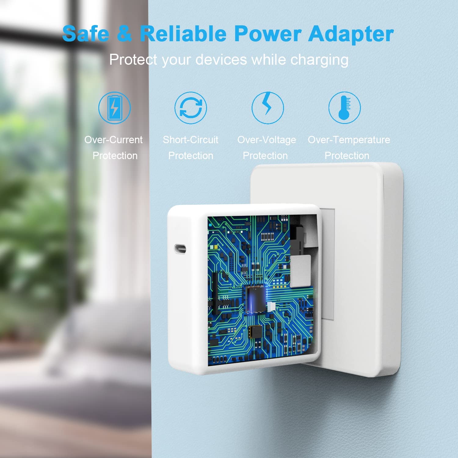 Compatible with 96W 87W 67W 61W 30W 【Replacement Macbook Pro Charger】 Input:100-240V 50-60Hz 1.8A, Output:5V/3A,9V/3A,10V/5A,12V/5A,15V/5A,18V/5A,20V/5A.Connector Size:USB C to C port,Watt:100W Max.Compatible 29W 30W 45W 61W 67W 87W,96W usb-c power adapter. 【Compatible with Apple Computer Models】Compatible with Apple MacBook Pro 16, 15, 14, 13 inch, New MacBook Air 13 inch 2022 2021 2020 2019 2018 2017, iPad Pro 12.9 11 inch 2020/2018 and iPad Air 10.9 " (2020) and all USB-C port devices, laptops and smartphones. Automatically recognizes and converts charging power. 【Super Fast Charger】100W USB-C power adapter with 96% charging efficiency, our charger delivers fast and steady current, the charger can fully charge most laptops in about 1 hour and 30 minutes. It can charge most cell phones from 0% to 80% in less than 20 minutes. With our chargers, you can charge quickly and efficiently at home, in the office or on the go, solving all your charging problems. 【100W Macbook Charger Features】100w usb-c power adapter is light weight and takes up little space. AC adapter is compatible with more Apple product models. Macbook charger meets electrical safety and design standards. Built-in IC chip technology protects against short circuits, overvoltage, overcurrent and internal overheating without worrying about functional device damage. Keeps your laptop safe from battery charging while you work. 【Service】 if you have any quality problems or suggestions for improvement, please feel free to contact our customer service team.