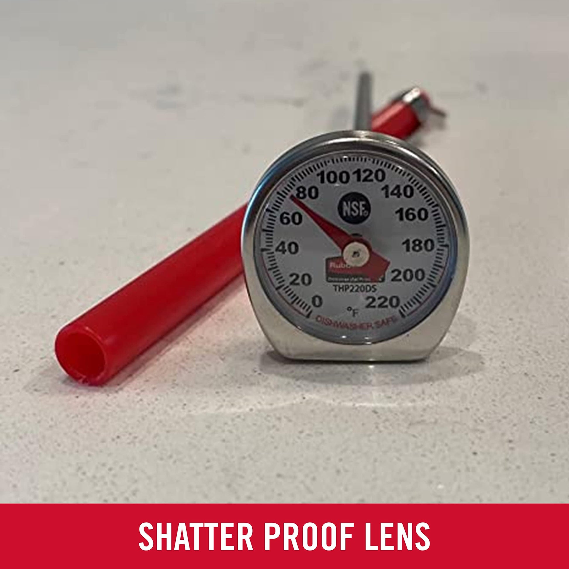 The Rubbermaid FGTHP220DS pocket thermometer has large numbers on its dial for user-friendly identification. Made of stainless steel with a shatter-resistant lens, this unit includes a protective sheath. It has a temperature range of 0 to 220 degrees Fahrenheit and reads in 2-degree increments.
